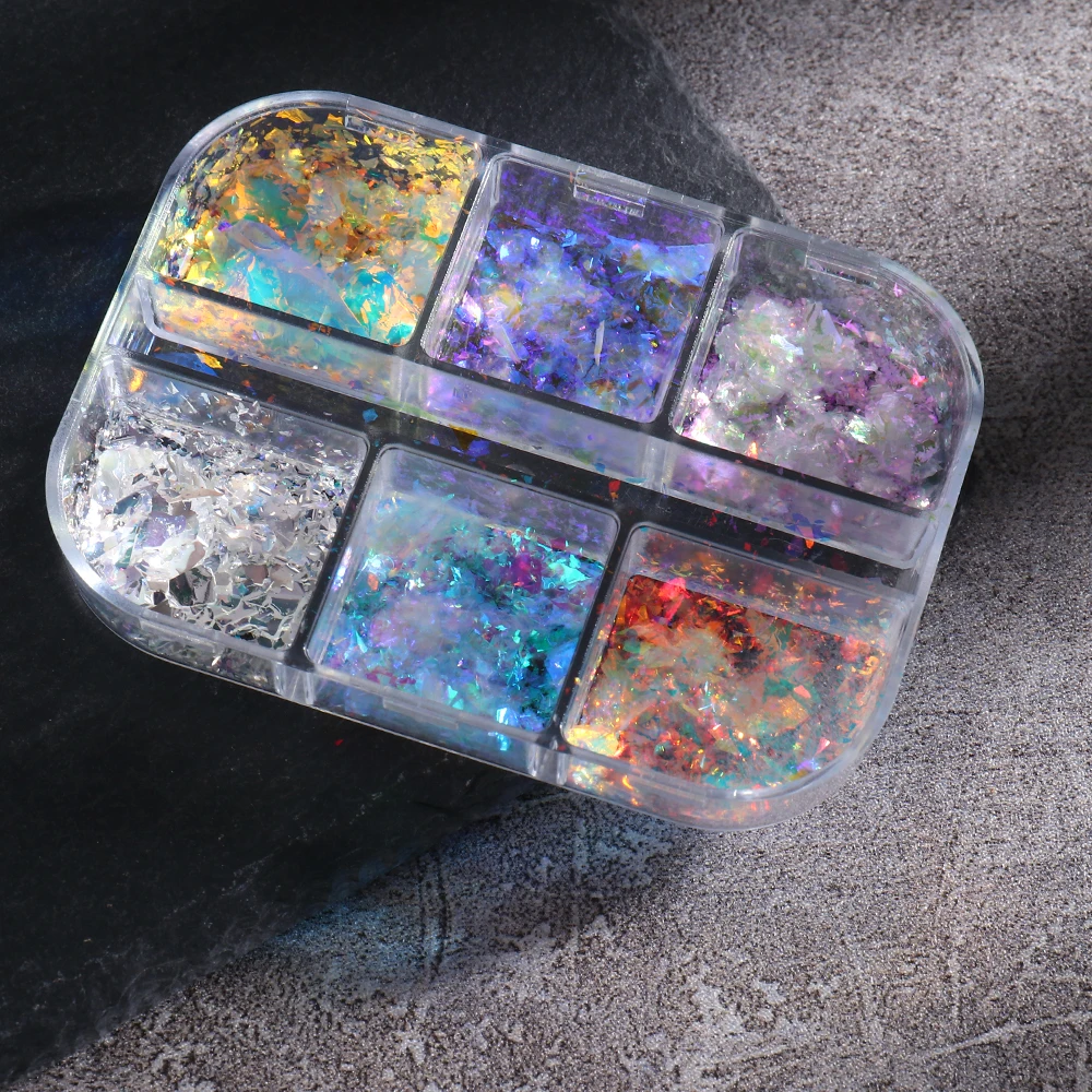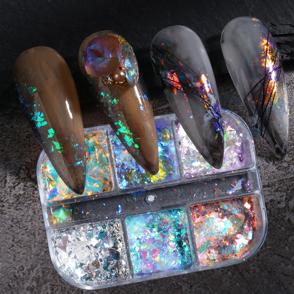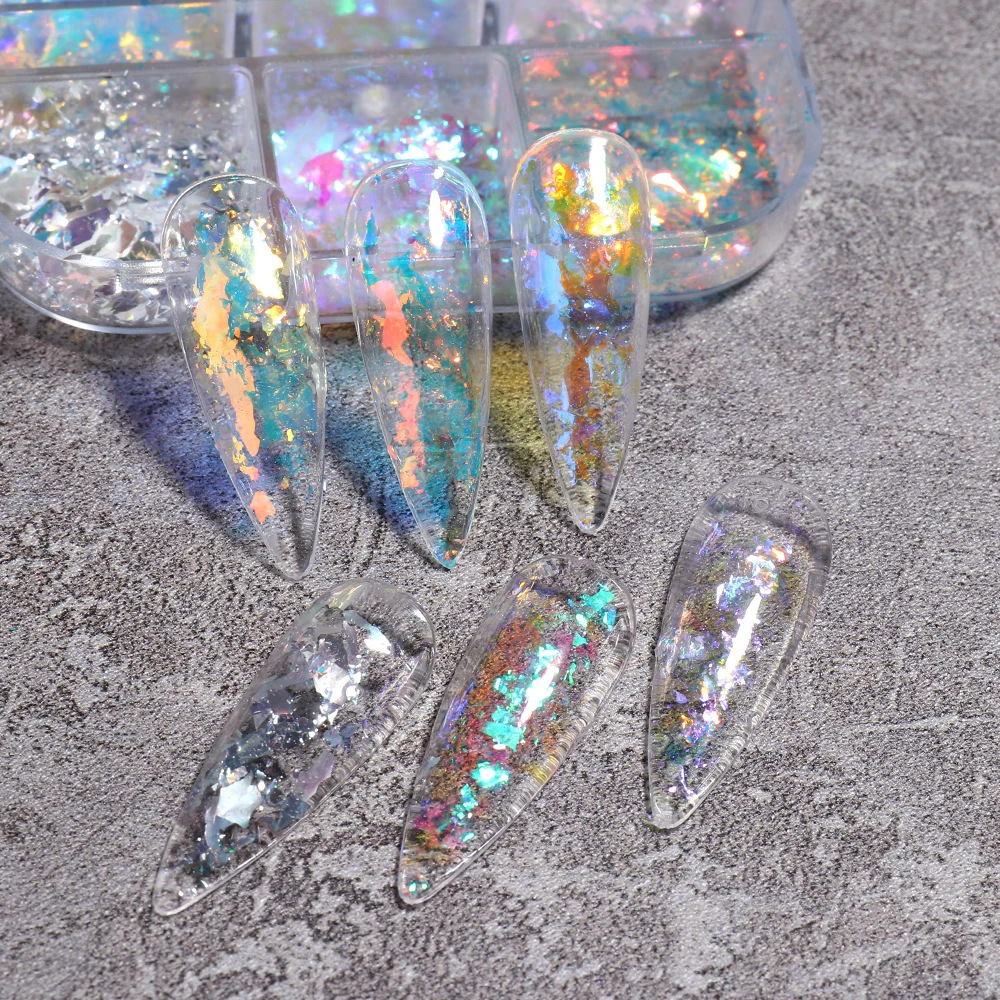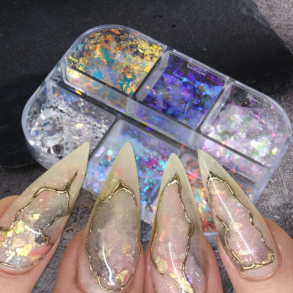 Блестки Aurora, 6 сеток, переливающиеся, для кристаллы для ногтей, с опаловыми огненными блестками, хлопья гвоздь, художественное украшение, зимний голографический дизайн NTXR