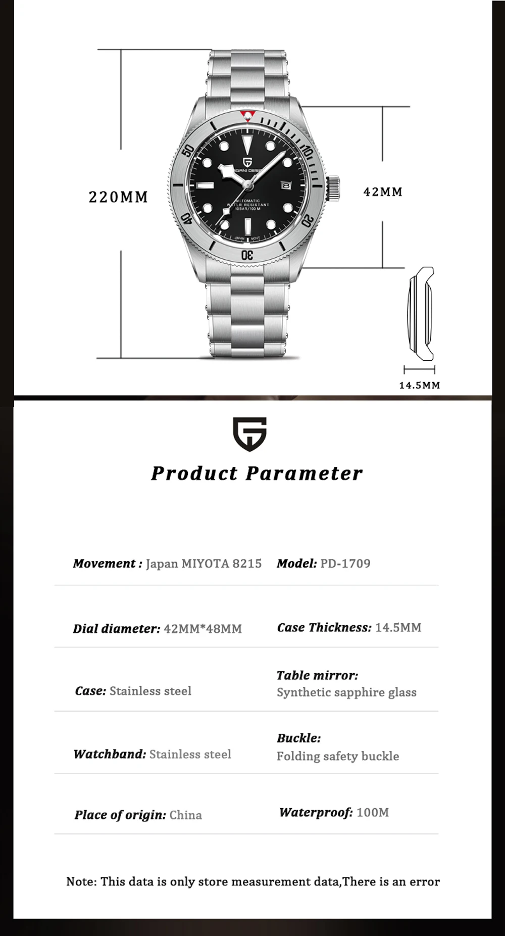 PD1709 Технические характеристики: дань стали Механизм: JAPAN MIYOTA ● Чехол из нержавеющей стали 316L 42 мм ● 50 мм наконечник для наконечника ● Ширина ремешка 20 мм ● Ремешок с заклепками из нержавеющей стали 22 см ● Сапфировое стекло ● Водонепроницаемость 100 метров ● Безель из нержавеющей стали ● Вес 192 гГарантийный срок: два года бесплатной гарантииСтандарт упаковки: профессиональная Водонепроницаемая пластиковая упаковка