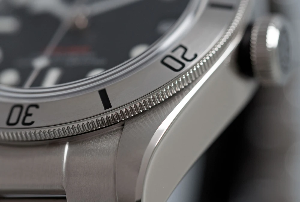 Другим очевидным дополнением является вставка из матовой стали. Браслет с заклепками и матовые стальные наконечники часов, эффект очень яркий, особенно с брызгами красного цвета на треугольнике в верхней части ободка. Принимая во внимание, что марку ссылаются на винтажные часы, это то, что винтажные коллекционеры относятся к ободку «ghost'». На оправе «ghost'» черный цвет будет выцветать и носить на светильник с серым или серебристым эффектом. Сталь BB имеет этот образ призрака, особенно при ношении на зеленом тканевом ремешке.