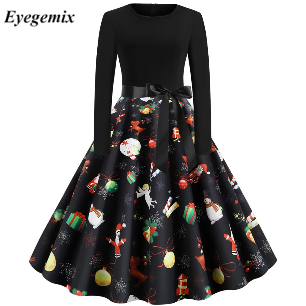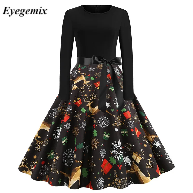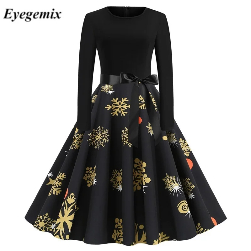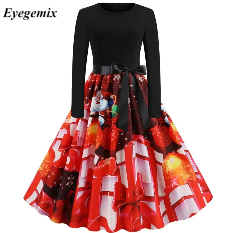 Зимние рождественские платья, Женский винтажный халат с принтом, элегантное вечернее платье с круглым вырезом, сексуальное Новогоднее платье с длинным рукавом