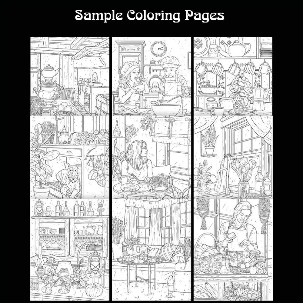 Эта замечательная книжка-раскраска для взрослых позволяет вам потерять себя в прекрасных деревенских кухонных сценах, с чугунными плитами, пантерами, упакованными с едой, деревенскими кастрюлями и сковородками, и многое другое!