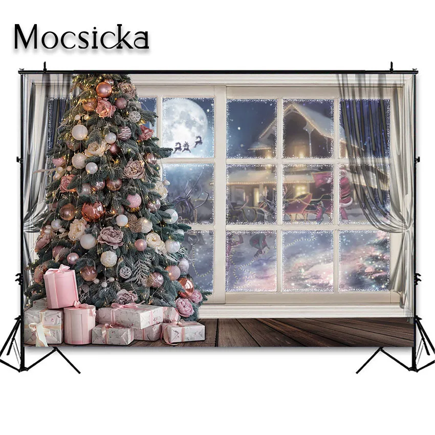 Mocsicka Рождественский фон для фотосъемки с Санта Клаусом зимние снежные Рождественские елки окно полный свет фон для фотосъемки