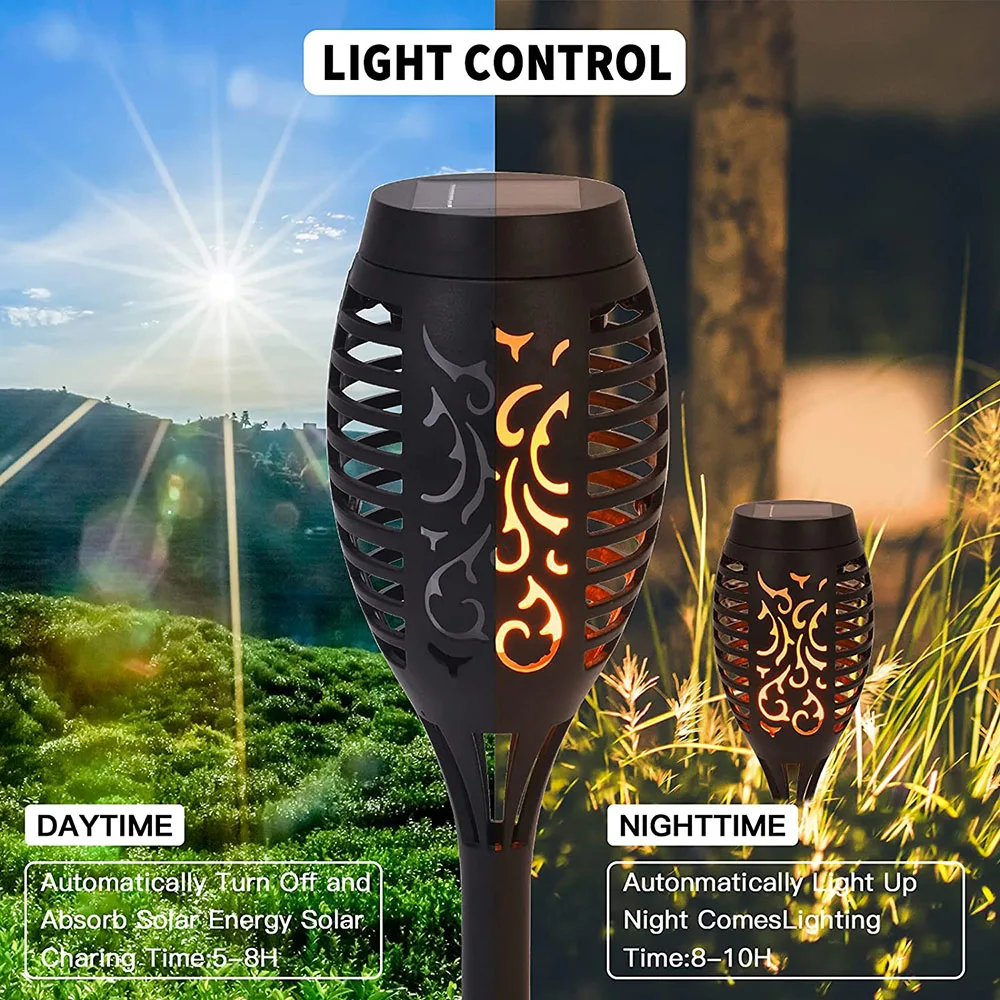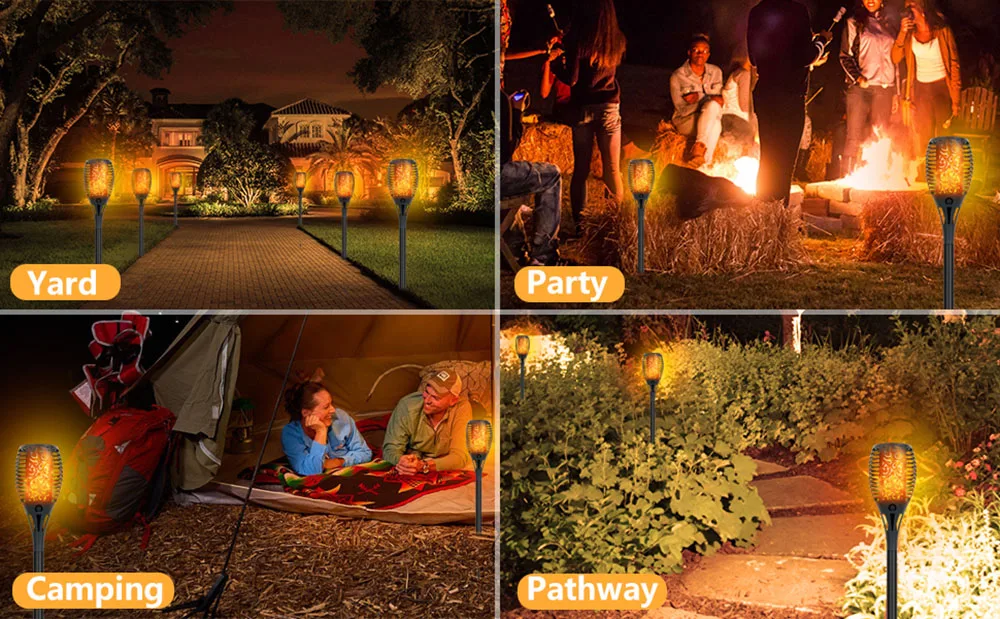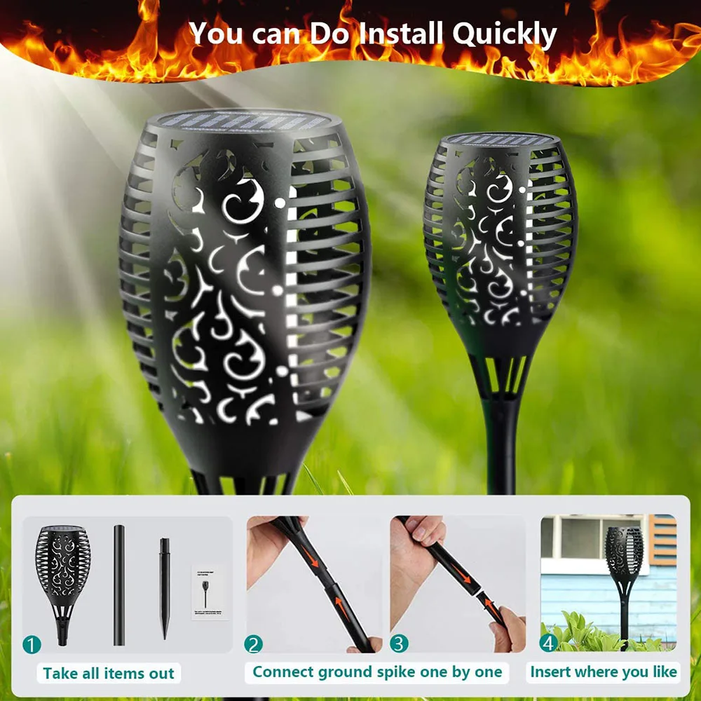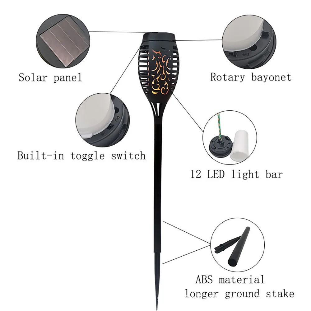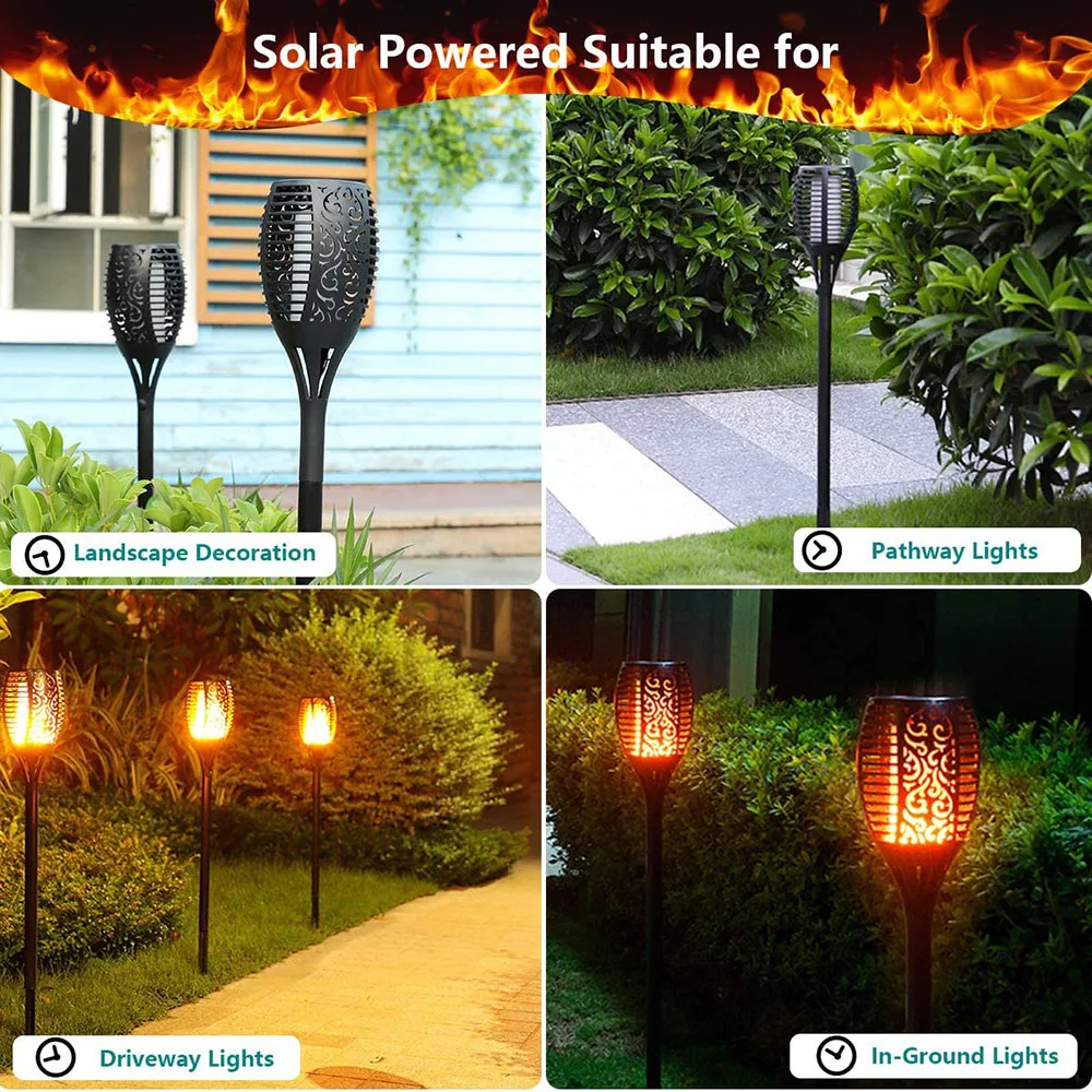 Светильник с пламенем-идеальный выбор для сада, двора, тропы, ландшафтных украшений и сада, вечерние, кемпинга, барбекю, Рождества, Хэллоуина, которые могут обеспечить идеальную атмосферу костра. Проводка не требуется, просто установите мерцающее пламя солнечного света в любом месте, где вам нравится, и наслаждайтесь настоящим и безопасным «пламенем»!