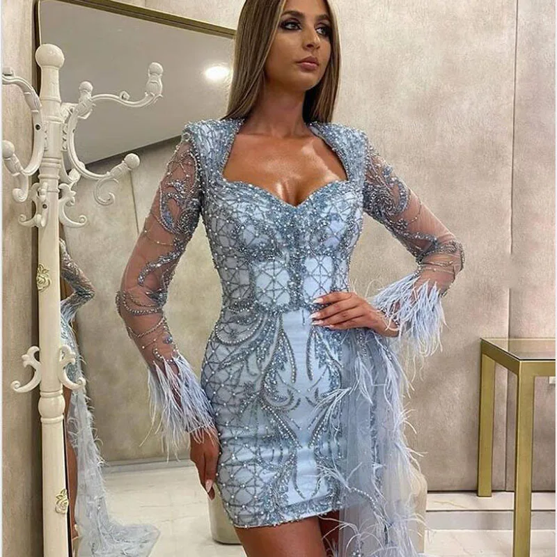 Небесно-голубое короткое платье для выпускного вечера с боковым шлейфом, кружевное иллюзионное платье с длинными рукавами для милой вечевечерние, вышитое бисером, женское платье для выпускного вечера