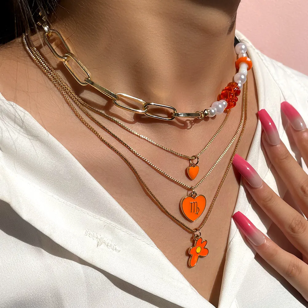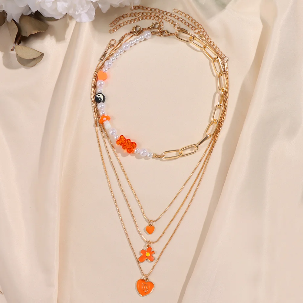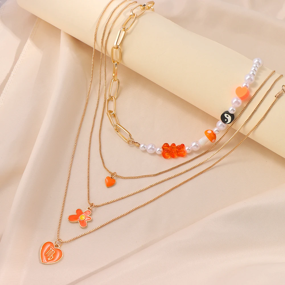 Женское Ожерелье из жемчуга Flatfoosie, многослойная металлическая цепочка с оранжевым мармеладным медведем и сердечком, ожерелье модные украшения