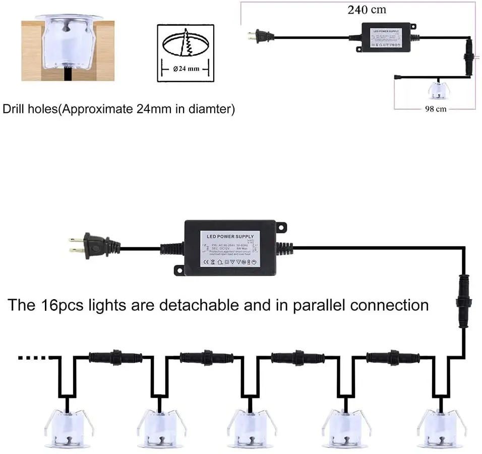 Съемное и параллельное соединение:16 шт огни съемные и в параллельном соединении, вы можете установить только часть из них в соответствии с вашими потребностями.