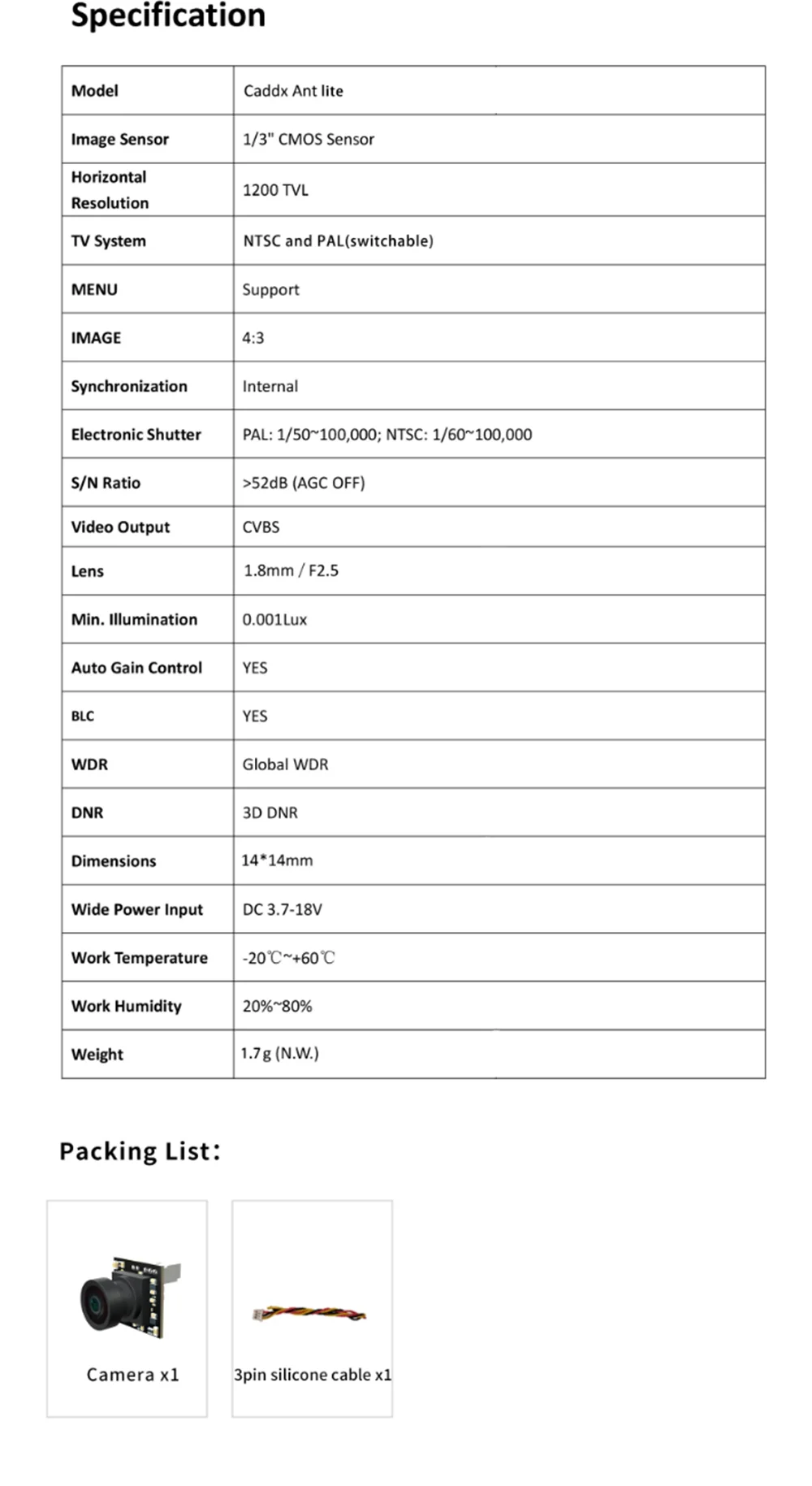 Спецификация:Модель: Caddx Ant liteДатчик изображения: 1/3 "CMOS сенсорГоризонтальное разрешение: 1200 ТВЛТВ система: NTSC и PAL (Переключаемый)Меню: ПоддержкаИзображение: 4:3Синхронизация: внутренняяЭлектронный затвор: PAL: 1/50 ~ 100000; NTSC: 1/60 ~ 100000Отношение S/N: >52 дБ (AGC OFF)Видеовыход: CVBSОбъектив: 1,8 мм/F2.5Мин. Луминация: 0.001LuxАвтоматическое управление коэффициентом усиления: ДаBLC: ДаWDR: Global WDRDNR: 3D DNRРазмеры: 14*14 ммШирокий Мощность Вход AC/DC 3,7-18VРабочая температура: -20 °C ~ + 60CРабочая влажность: 20% ~ 80%Вес: 1,7g (Н. В.)