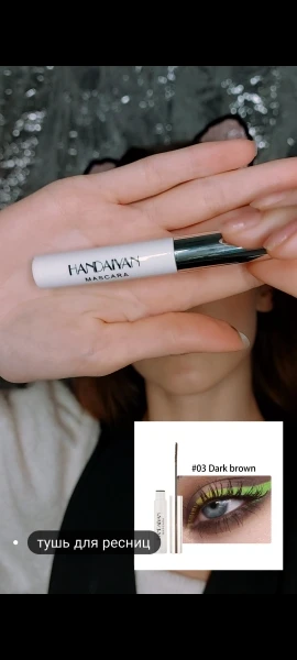 Коричневая тушь для ресниц Была доставлена в пупырке и защитной плёнке. Смотрится она выразительнее на светлых ресницах, а у меня чёрные. Щеточка очень интересная, непривычная, она особо не разделяет, но пигмент наносит плотно и ярко. Не сыпется, держится целый день. Смывается мицелляркой и гелем для умывания.