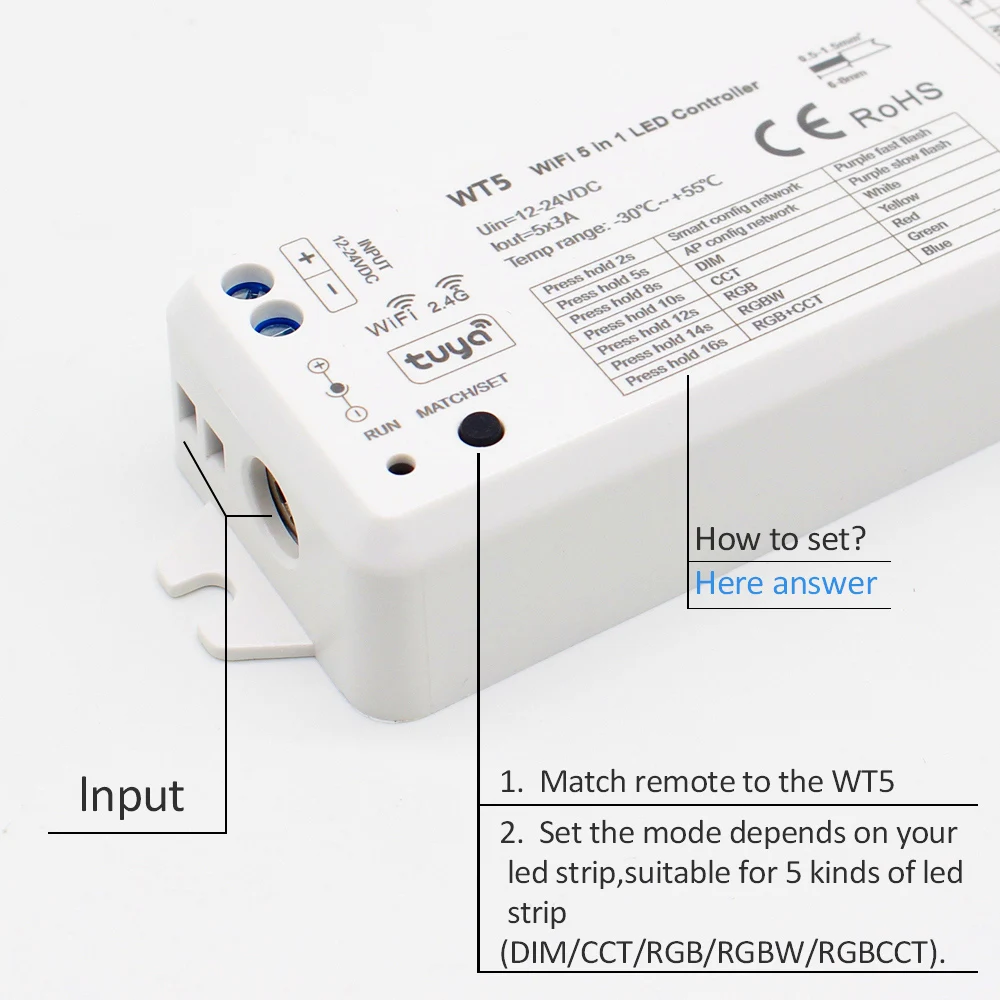 Примечание:Он используется для 5 видов различных светодиодных лент-светильник,-Одноцветный, CCT, RGB, RGBW, RGBCCT светодиодный ленточный светильник.Перед использованием, пожалуйста, убедитесь в том, что ваш светодиодный светильник соответствует вашей модели. Так что Светодиодная лента может работать должным образом.