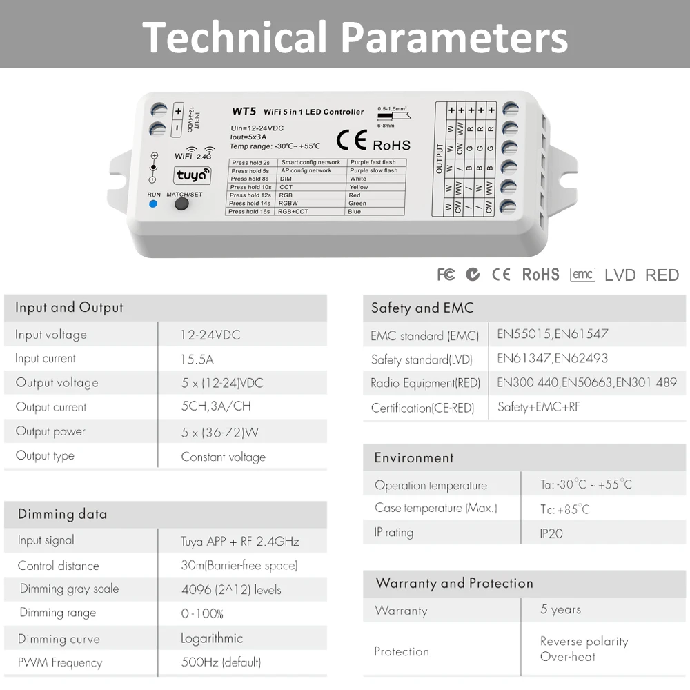 Входное напряжение: 12-24 В постоянного токаВыходное напряжение: 12-24 В постоянного токаВыходной ток: 5CH,3A/CHВход сигнала: приложение Tuya + RF 2,4 ГГцДиапазон затемнения: 0 -100%Шкала дальности затемнения: 4096 (2 ^ 12) уровнейЧастота ШИМ: 500 Гц (по умолчанию)Защита: обратная полярность перегрева