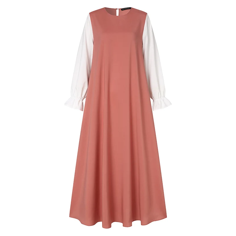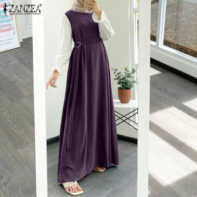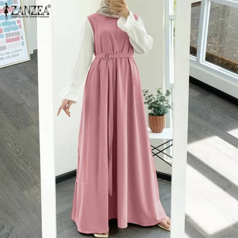 Элегантный женский Макси Сарафан ZANZEA в стиле пэчворк, однотонное мусульманское платье с длинным рукавом и поясом, с оборками на подоле, сарафан в марокканском стиле