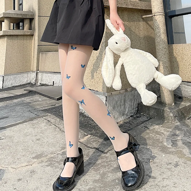 Колготки женские с принтом бабочек, прозрачные ультратонкие бесшовные шелковистые колготки в японском стиле Лолита, синие, на лето