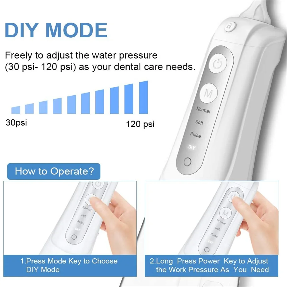 【Обновление режима DIY 】 в отличие от обычных, мягких и импульсных режимов других стоматологических струйных устройств, наша нить также имеет Модернизированный режим DIY, что позволяет регулировать мощность давления воды в диапазоне (30PSI-120PSI). Он особенно подходит для чувствительных полостей рта, так что любой, кто использует флушер, может наслаждаться приятным эффектом очистки зубной нити.