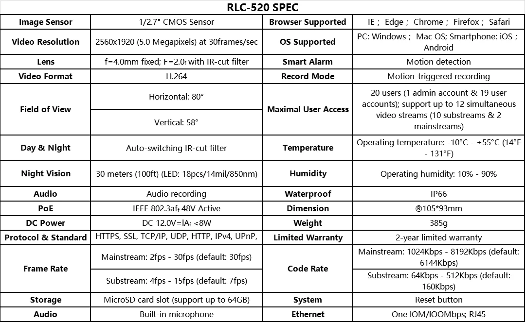 По сравнению с камерами 1080p, RLC-520-5MP видеокамера не только имеет лучшую ясность, но также улучшает чистоту и баланс цвета в эстетическом смысле. 1 / 2,7-дюймовый CMOS-сенсор, 4-миллиметровый объектив и разрешение 2560 x 1920 (5 Мп).
