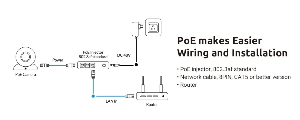 Power over Ethernet (PoE) - это передовая технология, которая позволяет вам использовать один сетевой кабель как для передачи видео, так и для передачи энергии, установка проще! Кроме того, благодаря PoE вы никогда не будете беспокоиться о электрических утечках!