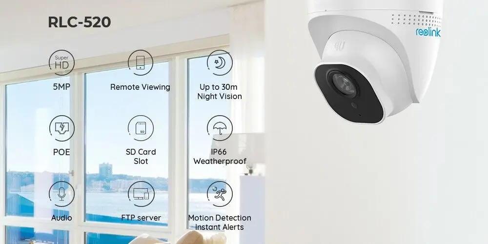 Reolink IP Камера 5MP POE камера видеонаблюдения уличная H.264 P2P аудио SD-карта слот RLC-520 (Без 12V 1A адаптера питания)