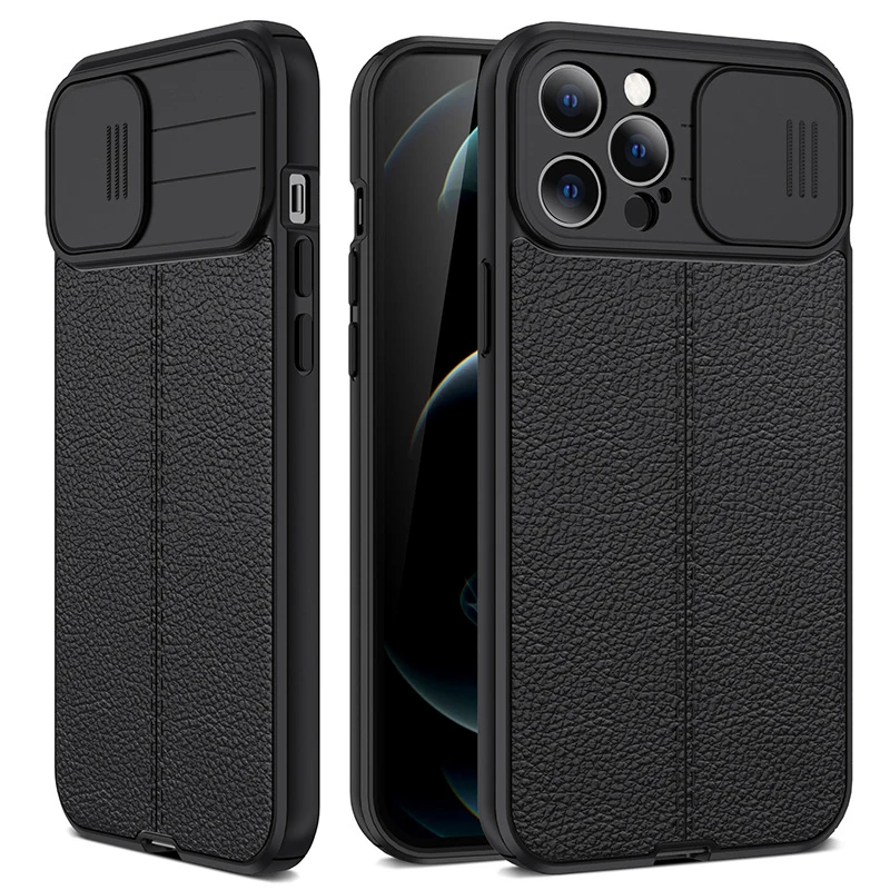 Feature 1Lychee Pattern Leather + Soft Silicone frame + Push slip Camera Protect