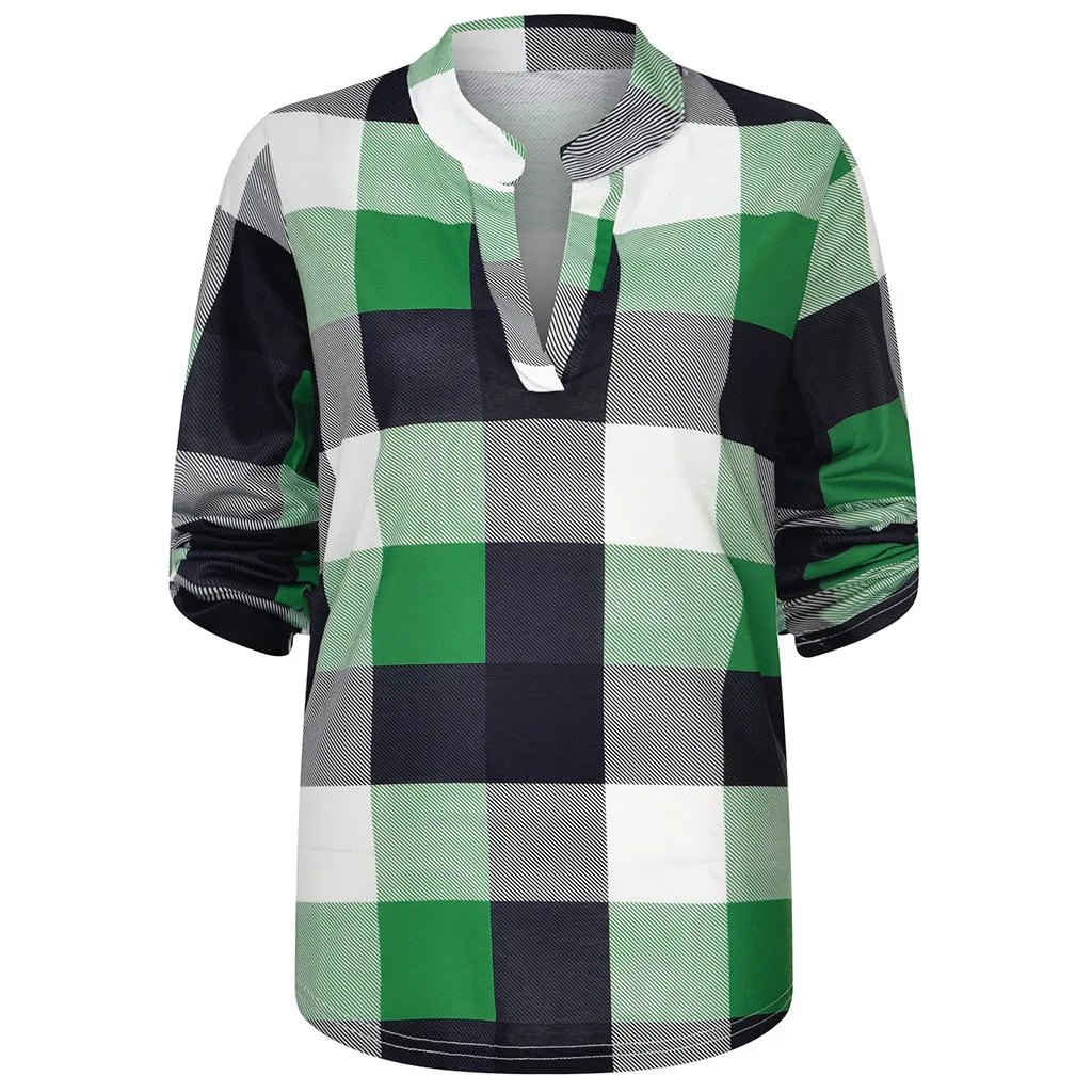 Женская рубашка в клетку, с V-образным вырезом и длинным рукавом