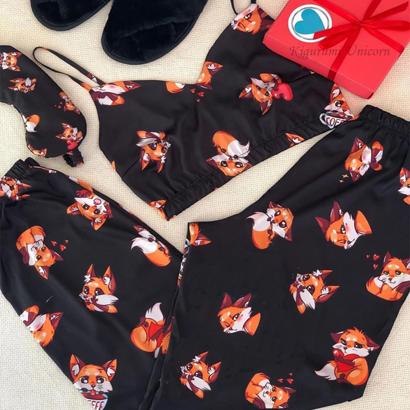 Пижама на тонких бретельках с принтом лисы, осенний комплект из дву...