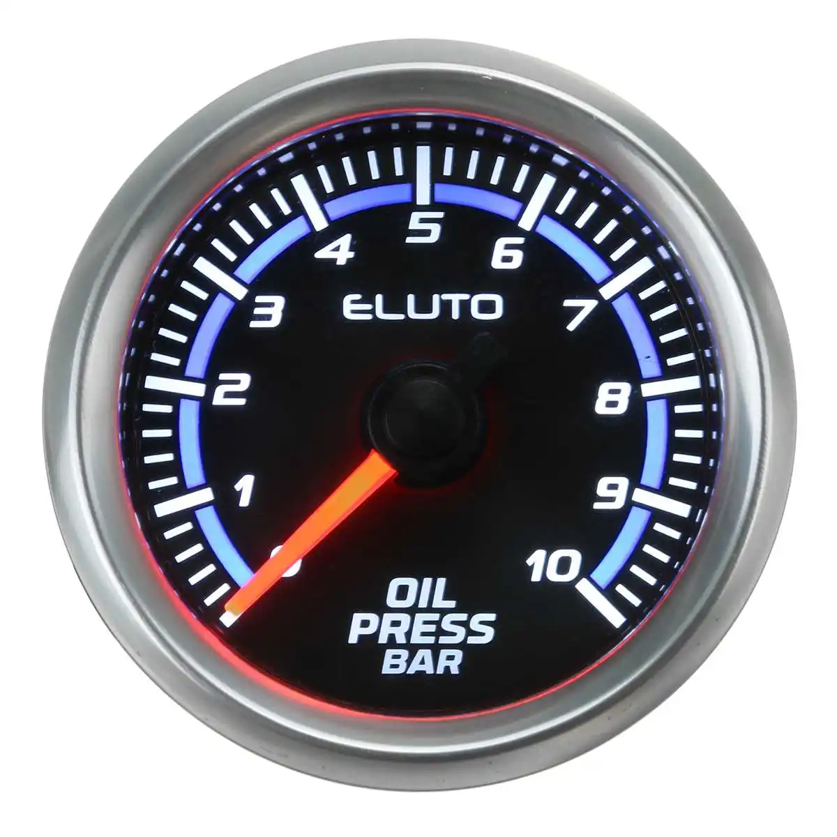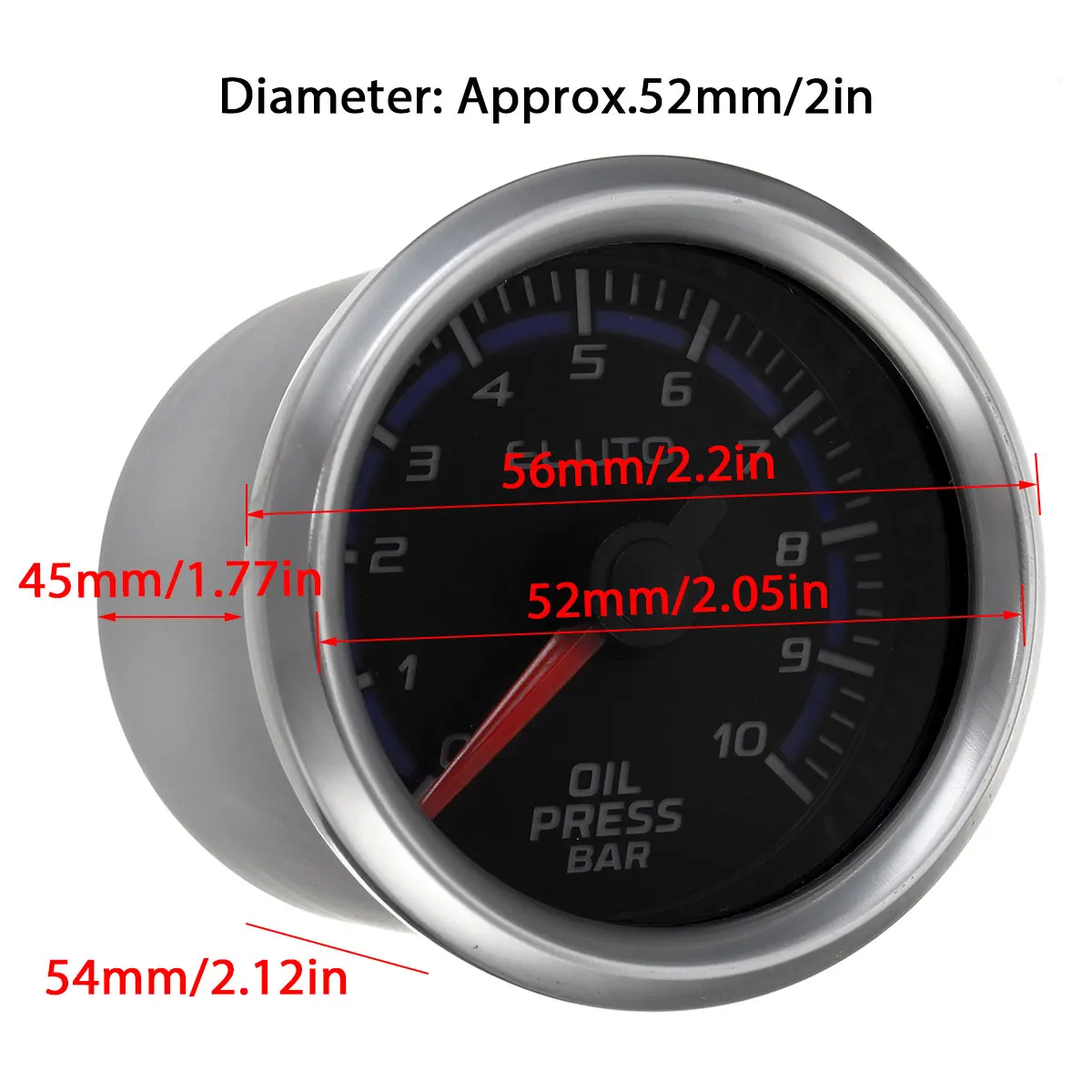 Особенности:-2 " (52 мм) Датчик давления масла черного лица с увеличенным тонированным объективом.-Показания давления масла от 0 до 10 бар.-Датчик давления масла с резьбой 1/8-27 NPT с монтажным оборудованием и инструкциями по установке.-Подходит для транспортных средств 12 В.-Красная светящаяся игла, яркий светодиодный дисплей в ночное время.