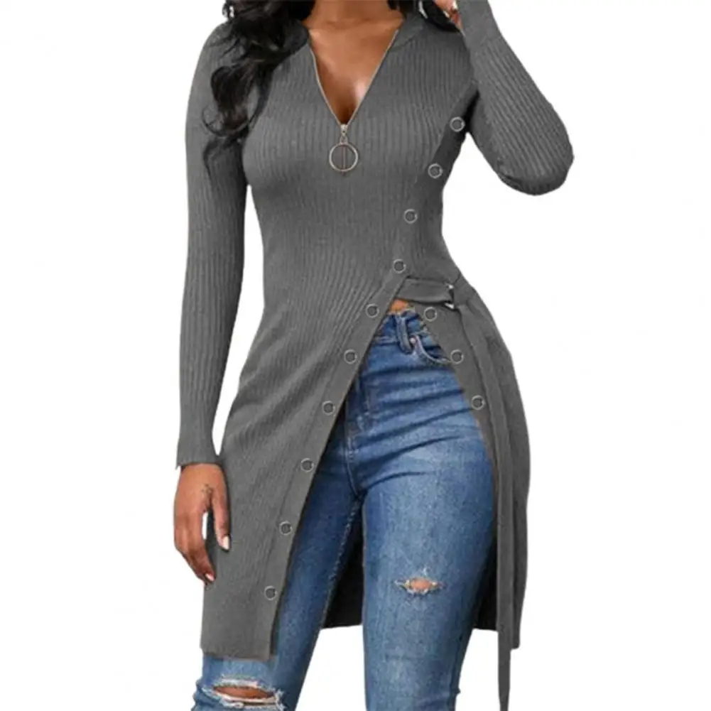 Женская трикотажная рубашка, длинная однотонная блузка с высоким разрезом, на молнии, с V-образным вырезом, в рубчик, трикотажные Блузы