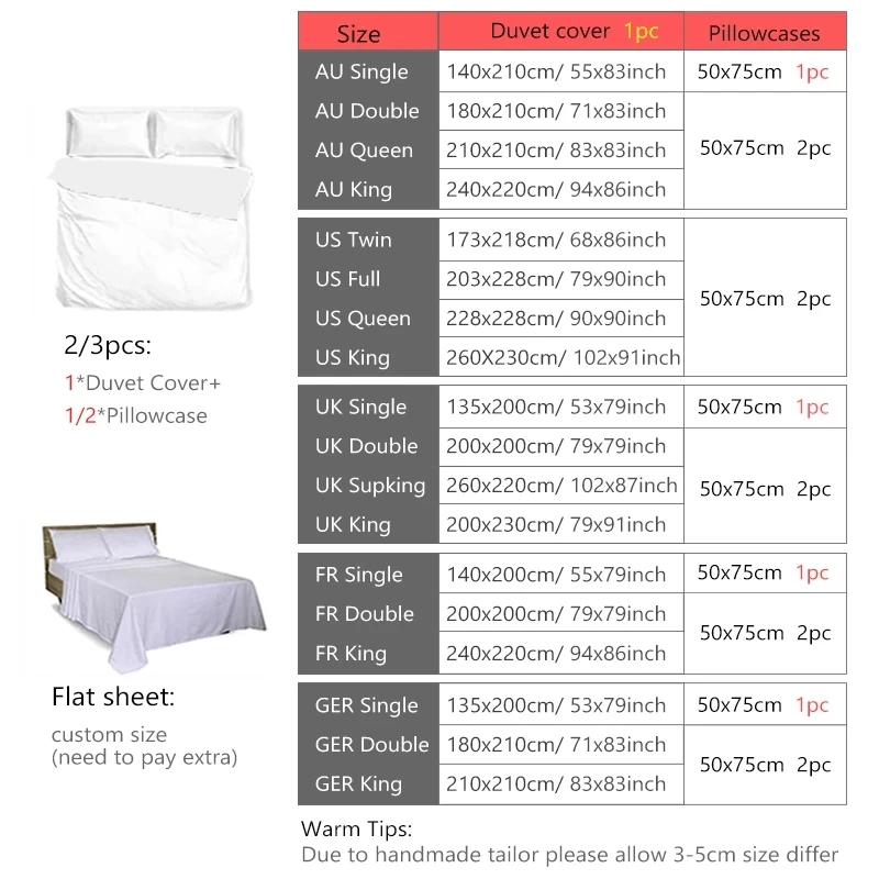 Упаковочный лист: 1 x пододеяльник + 1 /2 x наволочки для подушек.Материал: полиэстерКонструкция Fabirc: 90gsmБез наполненияСезон: весна, лето, осень, зима