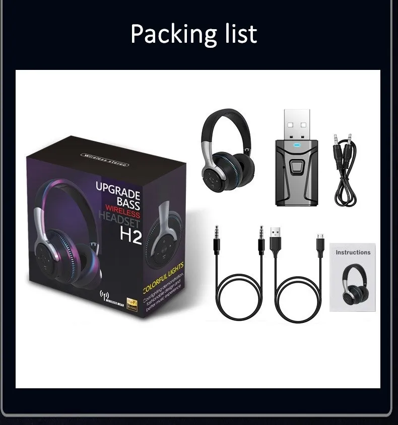 1 * беспроводные наушники1 * usb-кабель для зарядки2*3,5 мм аудио кабель1 * Руководство пользователя1 * адаптер Bluetooth