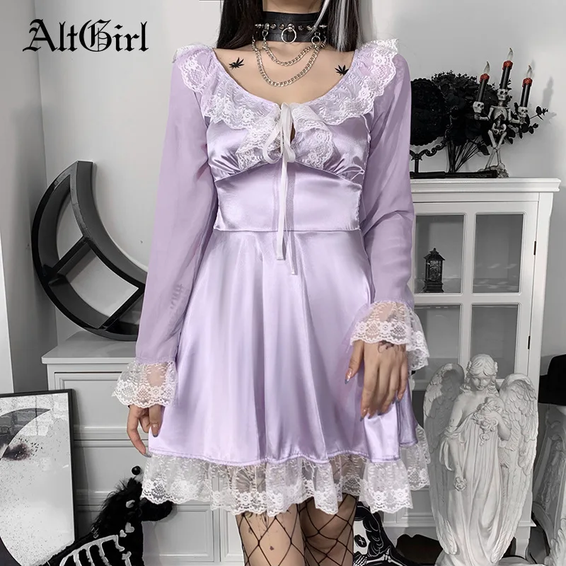 Женское платье в стиле лолита AltGirl Mall, волшебное Хлопковое платье в стиле гранж, кружевное лоскутное платье с длинным рукавом и высокой талией, женский наряд