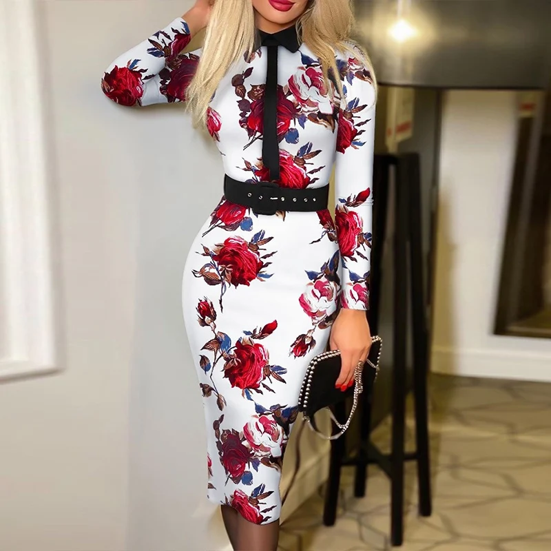 Женское облегающее платье, элегантное облегающее платье с принтом гусиная лапка и цветочным принтом, Осень-зима, для офиса и вечеринок, с ремнем