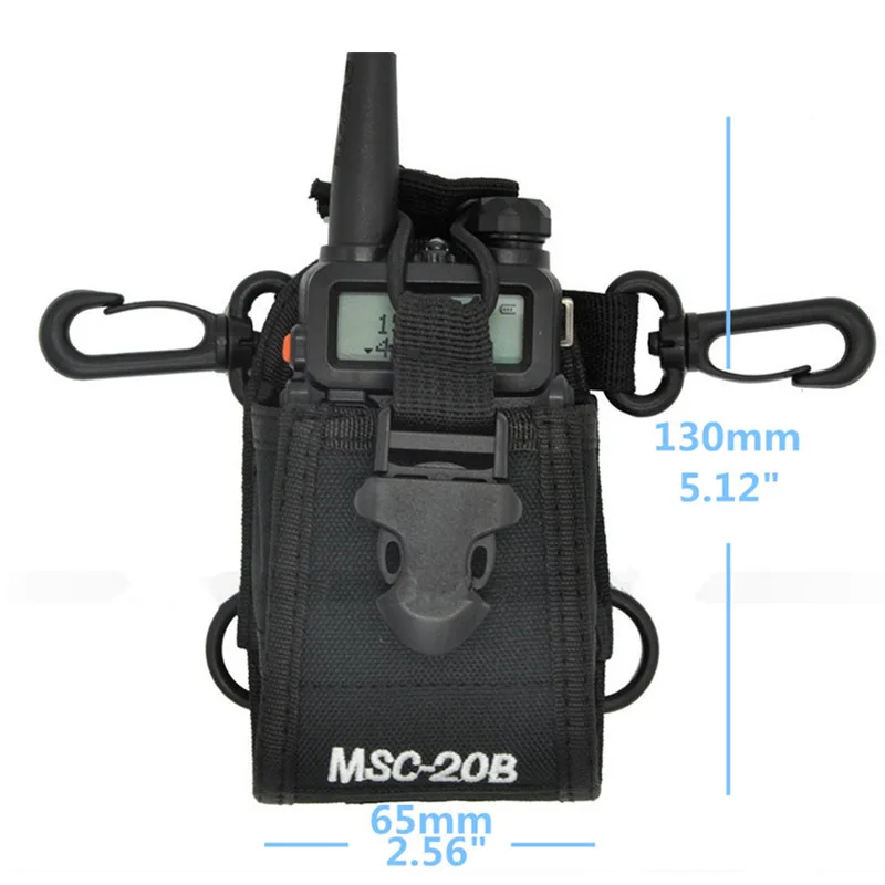 MSC-20B нейлоновая сумка для переноски подходит для более чем 90% Walkie talkie на современном рынке. Если размер вашего радио меньше 130*65*55 мм (не включает антенну walkie talkie, это не повлияет на упаковку), вы можете купить эту нейлоновую сумку.