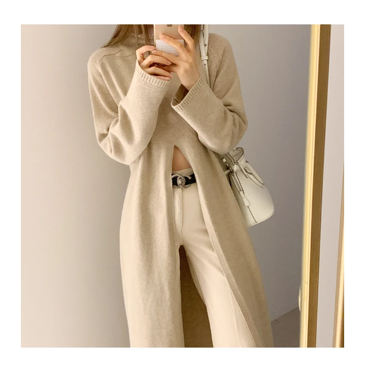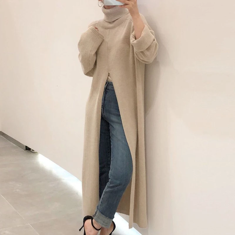 Водолазка с высоким разрезом, пуловеры, Свитера 2021, зимний шикарный длинный вязаный джемпер свободного кроя с длинным рукавом, топы, женская одежда в Корейском стиле