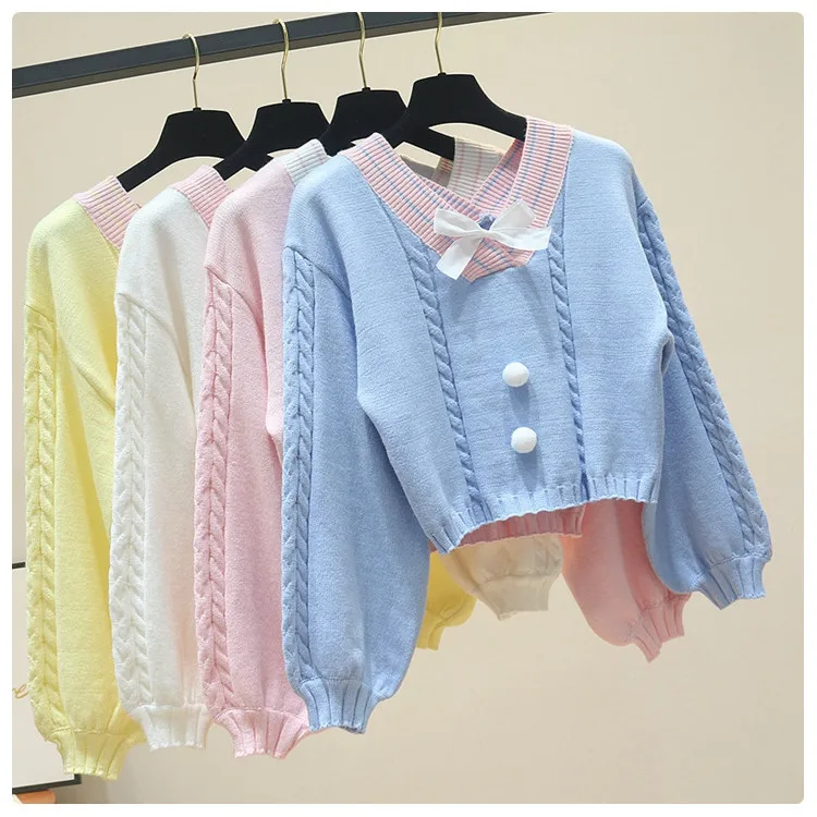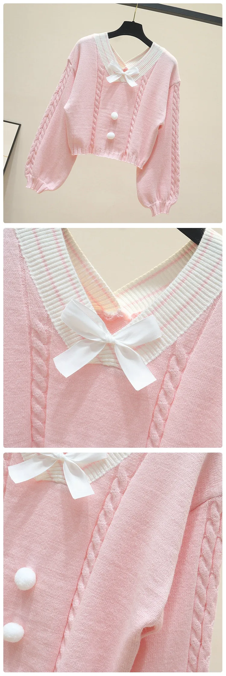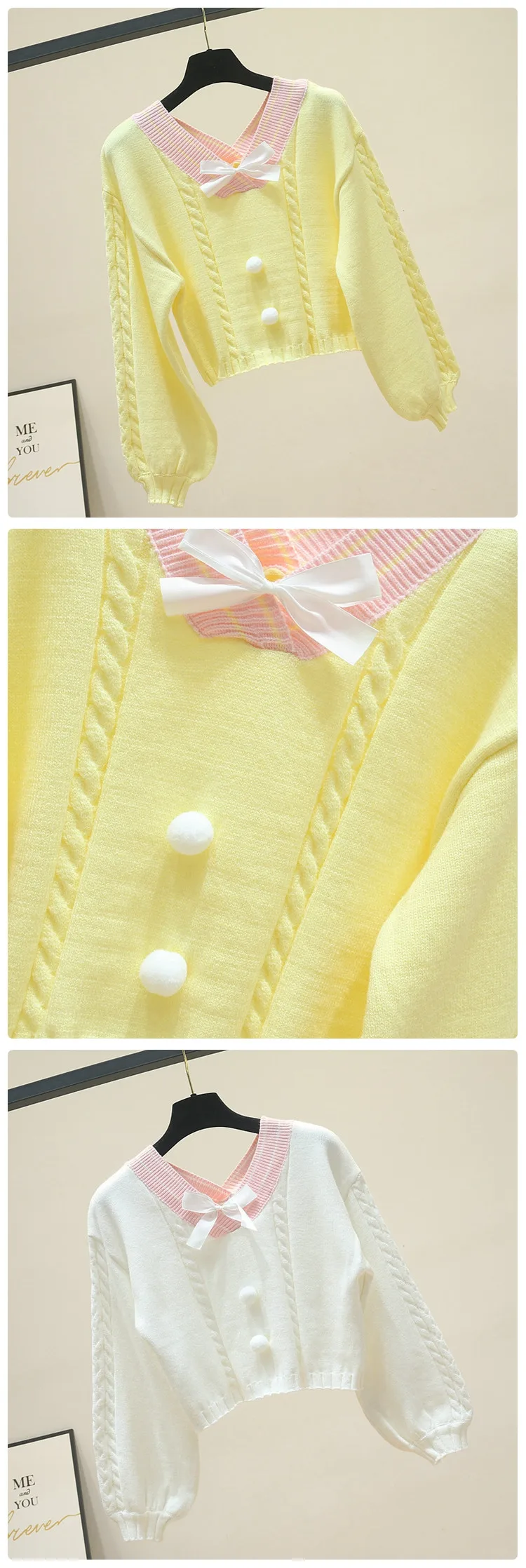 Женский вязаный свитер с бантом, белый винтажный пуловер с V-образным вырезом и длинным рукавом, розовый укороченный топ в Корейском стиле