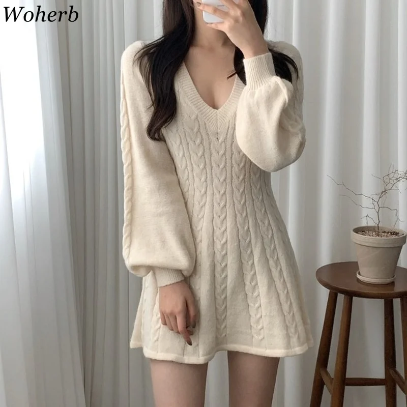 Woherb Новое вязаное платье-свитер, женские осенне-зимние мини-платья с V-образным вырезом и рукавами-фонариками и зауженной талией, корейские платья-трапеции, 2022