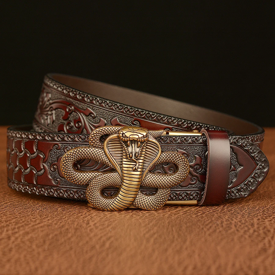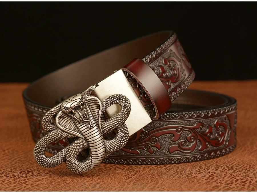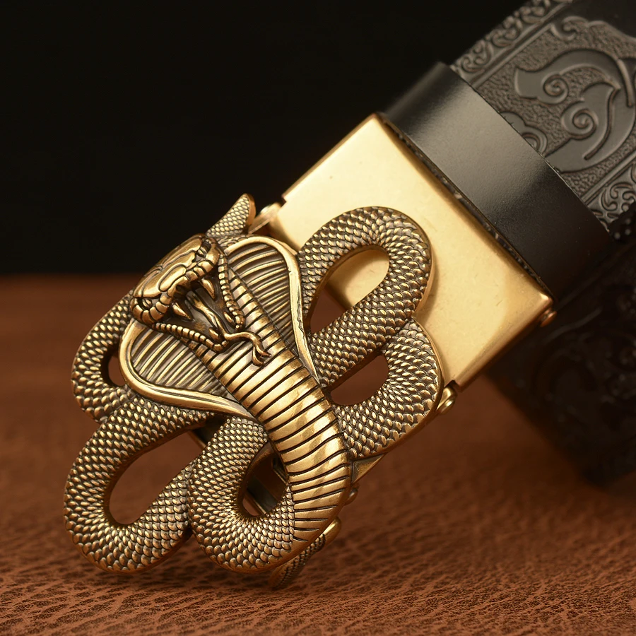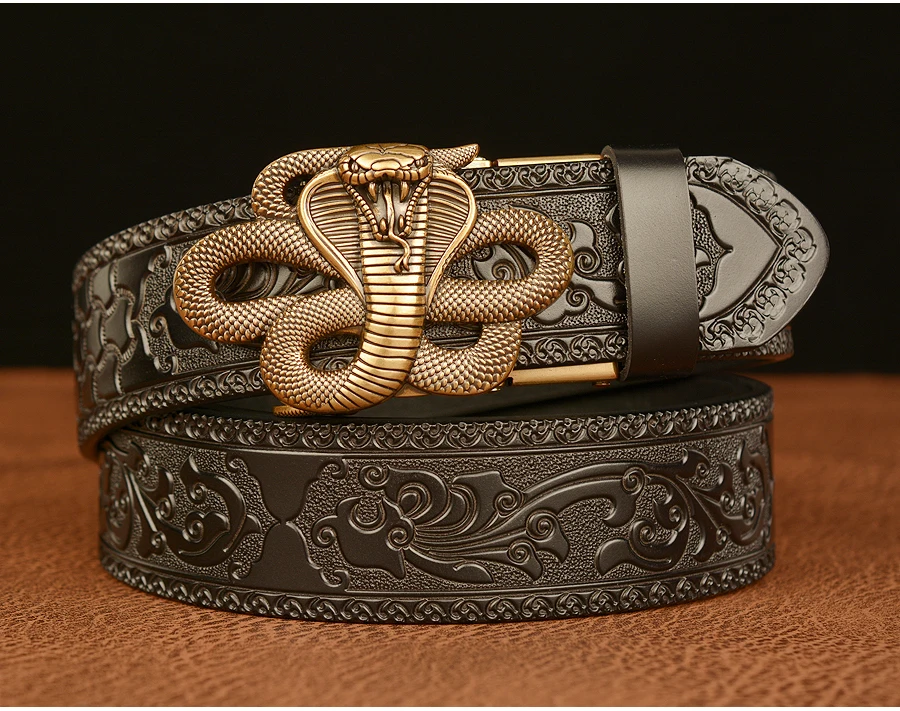 Ремни мужские из натуральной кожи, роскошные, с автоматической пряжкой в виде змеи, повседневные, прессованные, с цветком