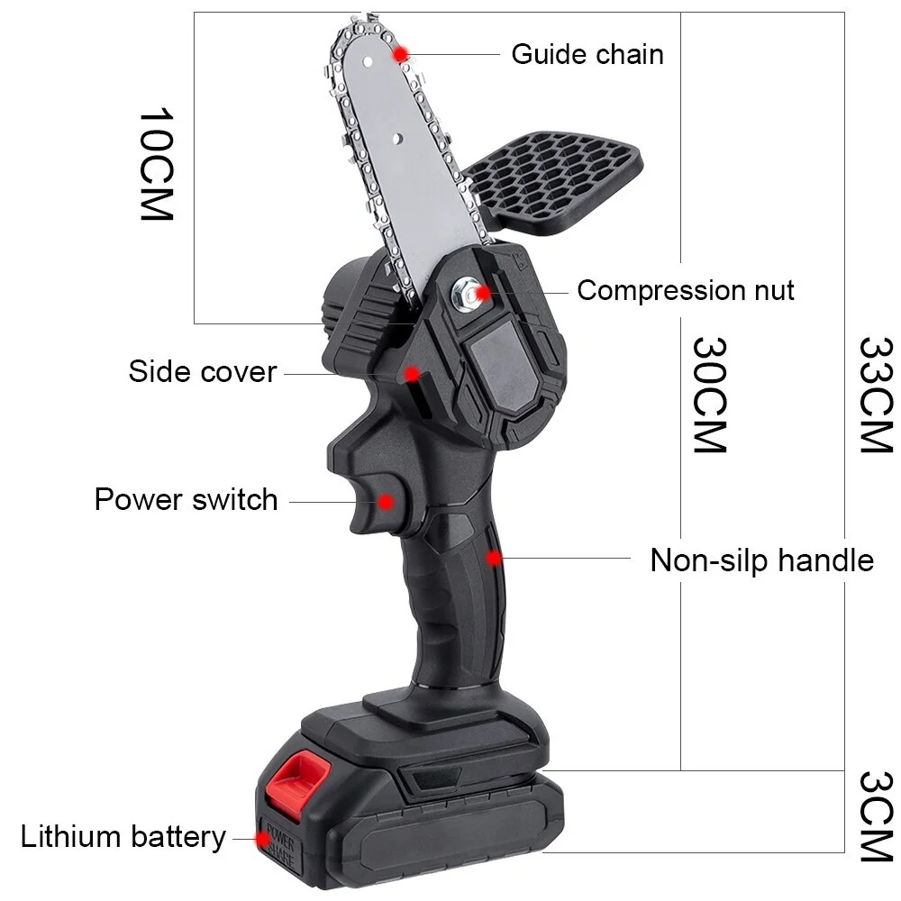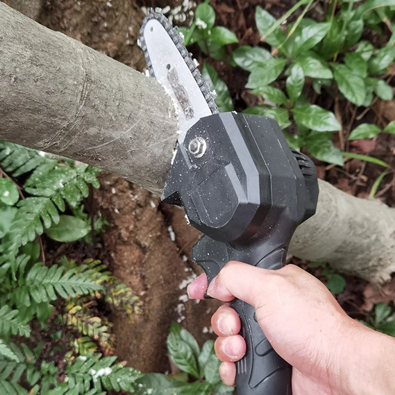 Перезаряжаемая Электрическая цепная пила, светильник и портативный, длительный срок службы батареи, без повреждений коры.Светильник вес тела, светильник и удобный, светильник вес конструкции, долгое время хранения и не устают руки.Щеточный двигатель из чистой меди, высокая мощность, быстрая резка, повышение эффективности.Практичная, быстрая скорость, низкое энергопотребление.Переключатель отличного качества, быстрая и медленная регулировка, плавное изменение скорости.Интеллектуальная плата управления цепью, защита от перегрузки, для удовлетворения ваших различных потребностей в конструкции.Специальная направляющая пластина, шарик из вольфрамовой стали не нужно смазывать, так что машина уменьшает сопротивление во время эксплуатации и уменьшает износ на машине.Маленький размер, можно держать одной рукой.Высококачественная направляющая цепь, глубокая закалка, более износостойкая, гладкая резка.