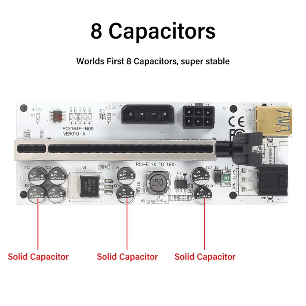 Совершенно новый 3C-Electronics 8 конденсатор PCI-E стояки 010-X.Это самые высококачественные GPU стояки на рынке со строгим контролем качества для обеспечения подключения и долгосрочной надежности. Все приспособления для шнуров изготовлены из более плотного и прочного пластика, что обеспечивает более тепловыделение.Наши доски толстые, что способствует долговечности и держанию карт без проблем. Пайка на нижней части каждой доски более обильная, предотвращая сокращение на досках и увеличивая долговечность во время добычи. Мощность через Molex или два разных 6-PIN входов на борту riser. На основной плате есть 6 светодиодный светильник s и один светодиодный светильник на чиповой плате 1X. Он может помочь шахтеру лучше контролировать неисправности.