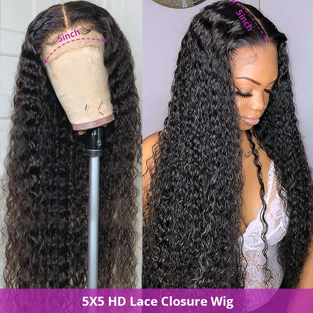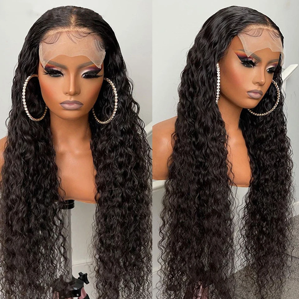 Парик с глубоким волнистым закрытием 4X4 5X5, прозрачные человеческие волосы, кружевные парики, предварительно выщипанные отбеленные узлы, парики, свободная волна воды, кудрявый фронтальный парик