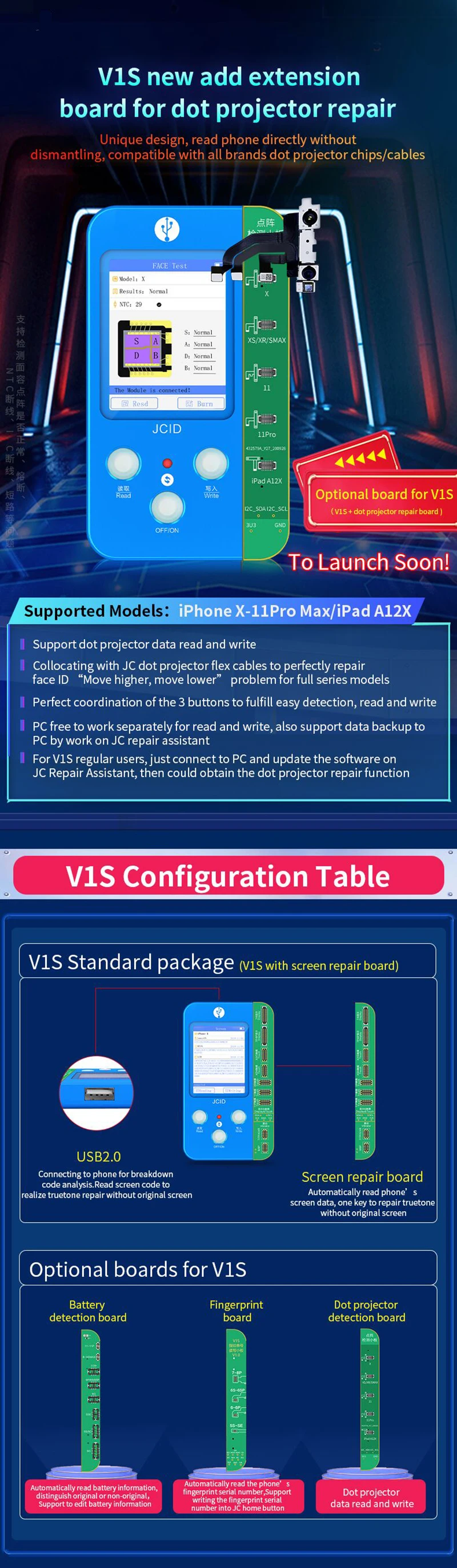 JCID V1S матричный кабель для ремонта iPhone 8/8P/X/XR/XS/11 Pro/11Pro Max Face ID & Truetone без оригинального приемника PFC Use