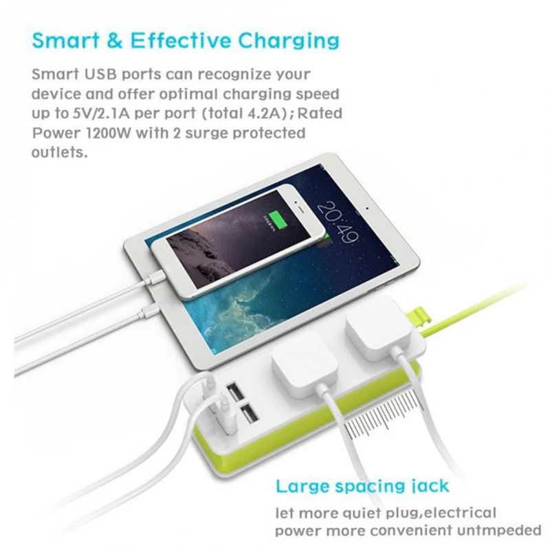 Сетевой фильтр с несколькими розетками, защищенный от перенапряжения, с 2 выходами и 4 USB-портами для зарядки, удлинитель на 1,5 м, адаптер питания для дома