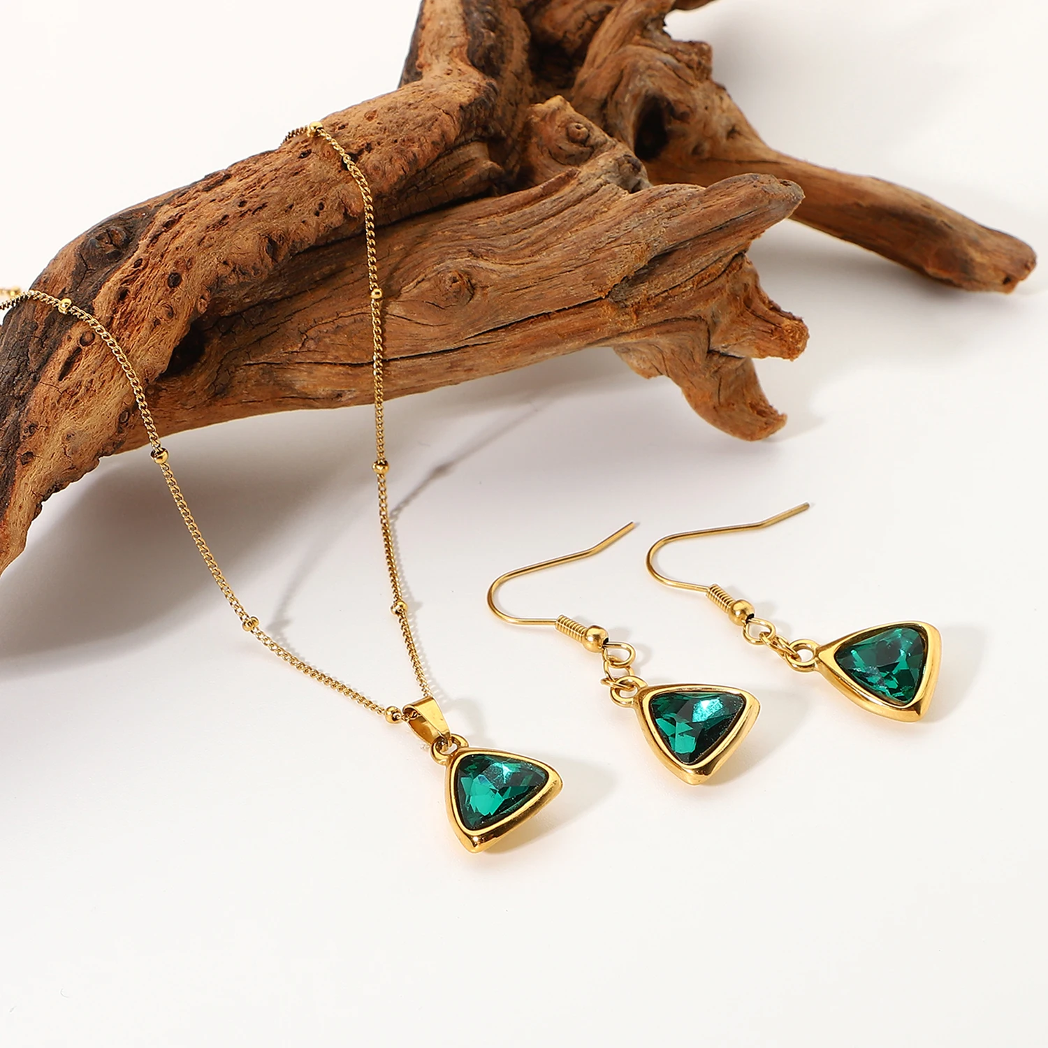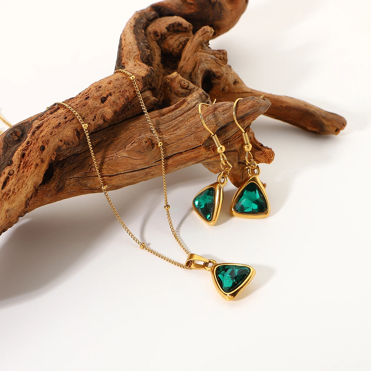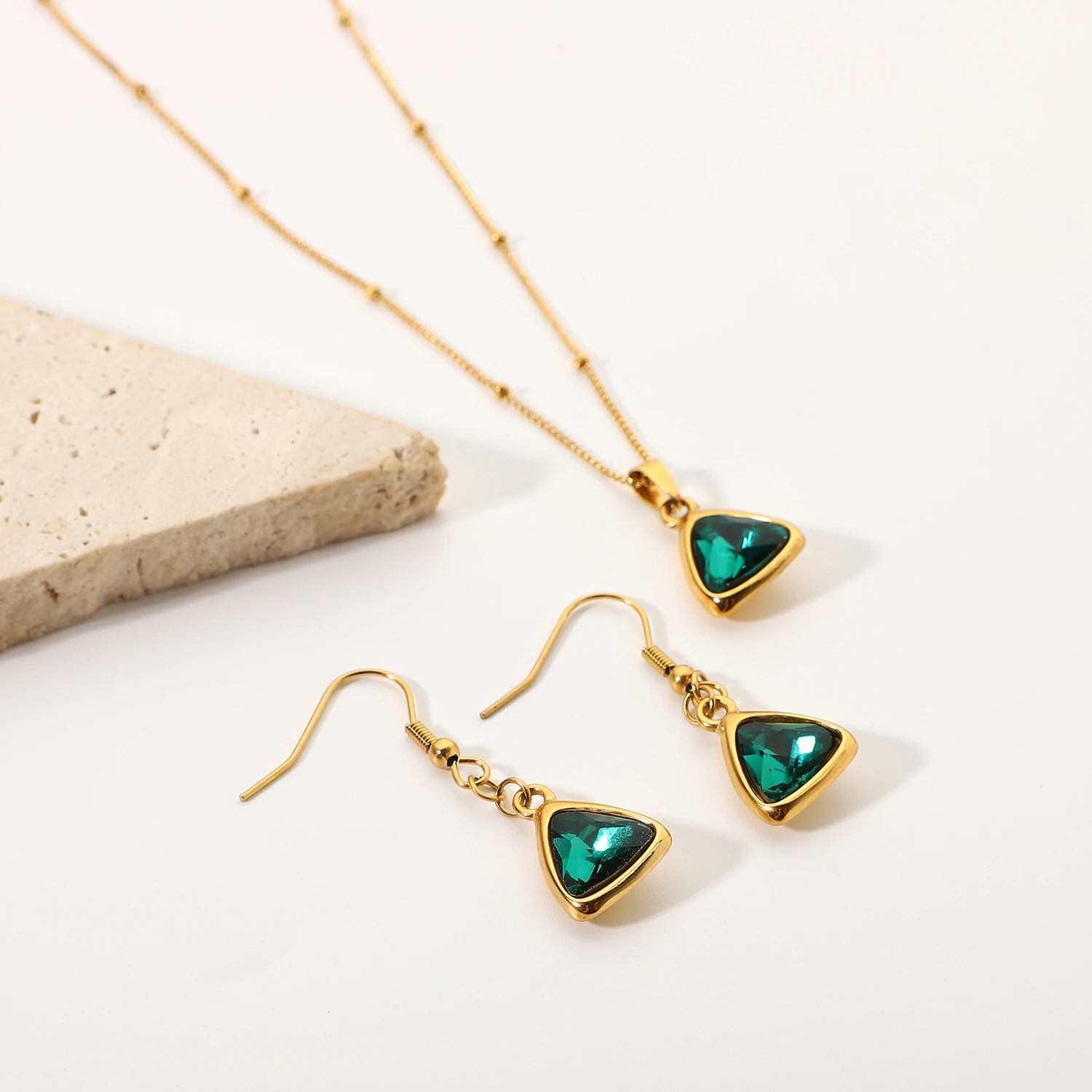 Женское Ожерелье с треугольным изумрудом, зеленые серьги-подвески геометрической формы, позолоченная цепочка до ключиц из нержавеющей стали 18 карат, недорогие ожерелья