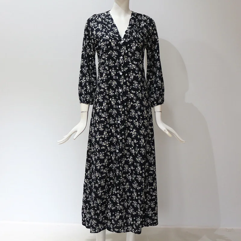 Осеннее длинное платье с цветочным принтом, женская одежда с V-обра...