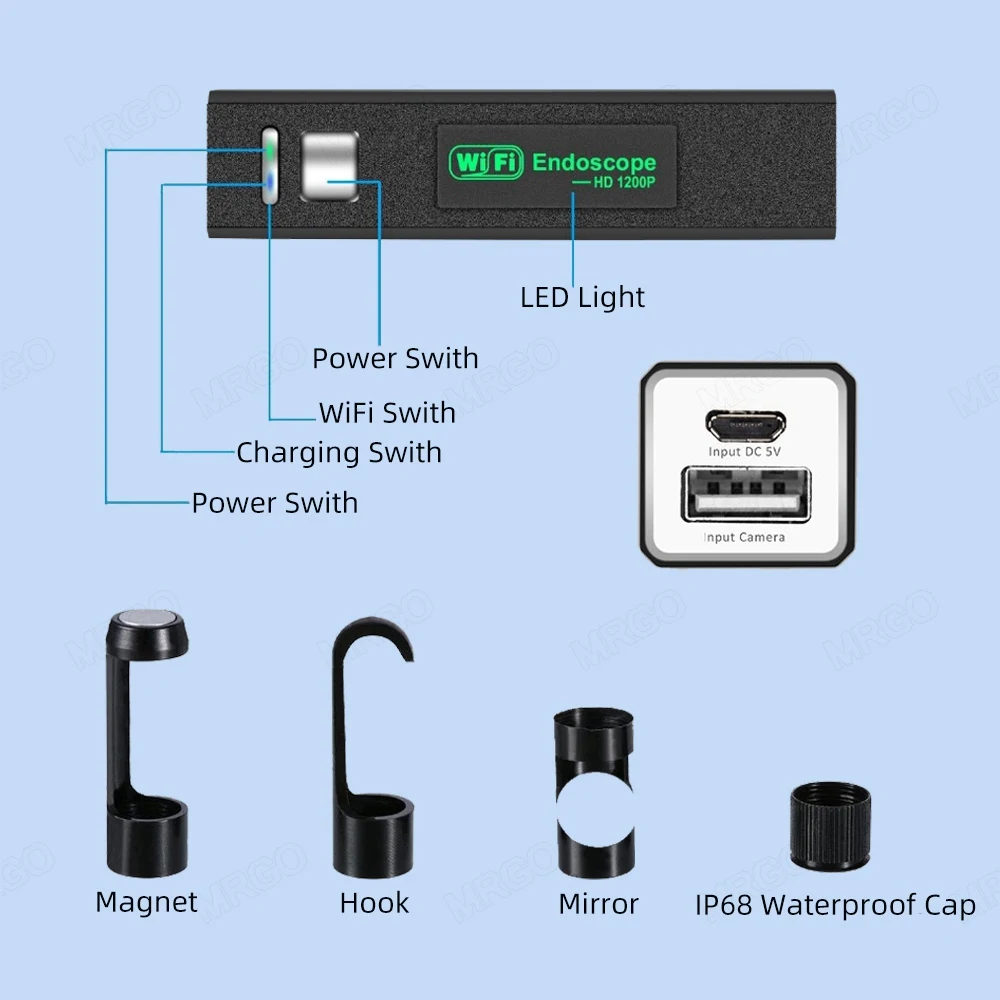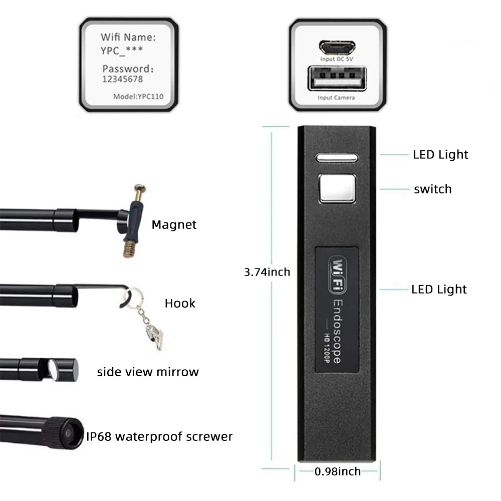 Диаметр камеры: 8 мм + WIFIУгол обзора: 70 градусовФокусное расстояние: 3-8 см (не может использовать его в качестве камеры видеонаблюдения)Usb-порт: Micro USB/Type-c/USBРазрешение: 640*480, 1280*720, 1920*1080 Для HD модели (8 мм)Уровень водонепроницаемости: IP68Светильник: 8 регулируемый белый светодиодныйРазмер датчика: 1/5 дюймаЧастота кадров: 17 кадров в секундуИсточник питания: 5 В постоянного тока через USBФормат фото: JPEGФормат видео AVIСистема поддержки: для Android (требуется поддержка OTG и UVC )/для Windows 2000/для XP/для Vista/для Windows 7/8/10)Для IOS(WIFI Check.APP) / MAC(Photo Booth)