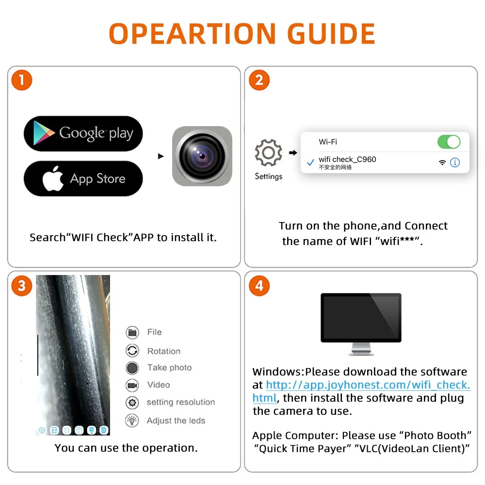 Как использовать на мобильных телефонах Android①Скачать приложение: Найдите «WIFI Check»Приложение в Google Play Store, или сканирование qr-кода ниже, или введите URL:Http://app.joyhonest.com/wifi_check.html②Установите приложение на телефон.③ Подключите эндоскоп к телефону, затем вы можете использовать его.Как использовать в системе Windows①Enter URL:Http://www.51scope.cn/files/setup.rarДля downlad диск "ViewPlayCup".②Install накопителя в ПК③ Подключите продукт к ПК, откройте диск "Smart Camera". Вы можете начать использовать этот продукт.