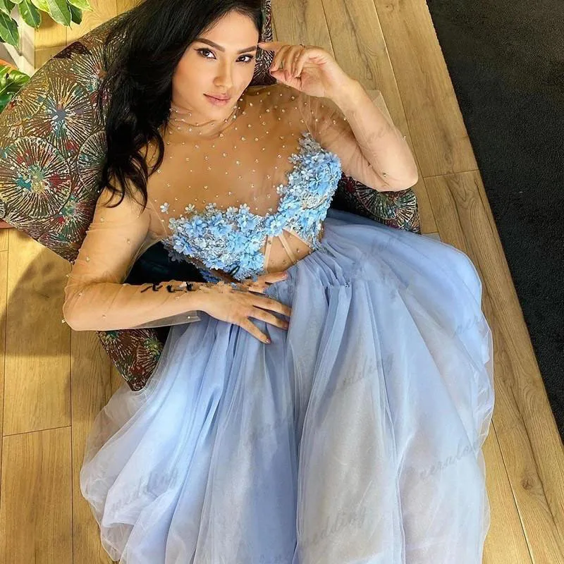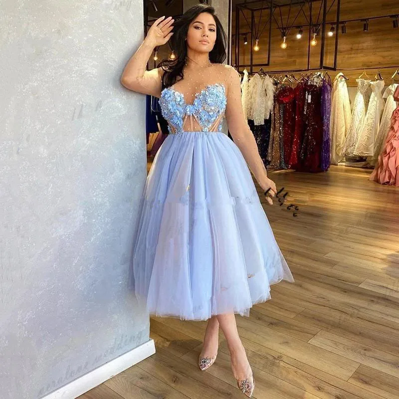 Платье Короткое голубое для выпускного вечера, с длинным рукавом и жемчужинами