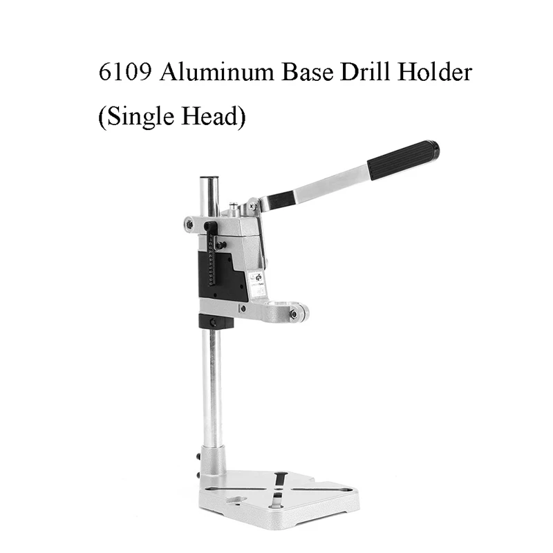 Особенности:-Изготовлен из алюминиевого сплава, прочный и долговечный.-Шкала дальности 60 мм, гуманизированная конструкция, обеспечивает справочную работу и более точную.-Пластиковая крепежная крышка, регулируемый диапазон патрона держателя 38-42 мм. Если электрическая дрель свободная, вы можете обрезать пластиковую крышку, чтобы зафиксировать ее.-Материал из алюминиевого сплава, дизайн расширения на земле, который может быть установлен тиски формы ad.-На полезную модель используется для электрической держатель дрели;-Сверлильный Пресс имеет алюминиевый светильник, удобный для использования и имеет монтажные отверстия, чтобы его можно было закрепить на верстаке;-Сверлильный пресс также оснащен шкалой регулировки глубины и остановкой для дополнительной функциональностиПосылка включает в себя:Тип A :1 шт. x алюминиевые плоскогубцыТип B:1 шт. x 6109 держатель для сверла с алюминиевым основанием (одна головка)Тип C: 1 шт. x 6109 держатель для сверла с алюминиевым основанием (двойная головка)