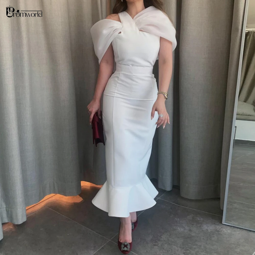 Белое Атласное Платье-Русалка на одно плечо с пышными длинными рука...