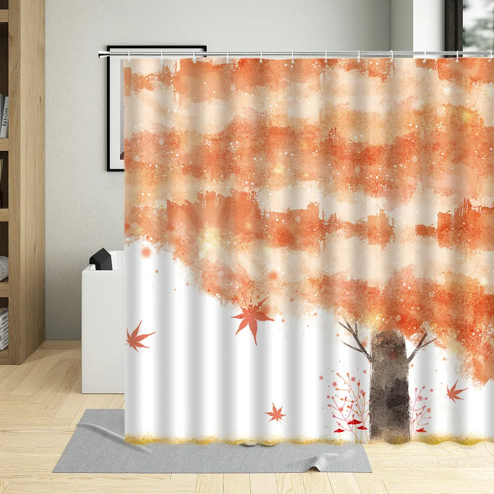 Осенняя занавеска для душа с пейзажем, красные кленовые цветы, луго...