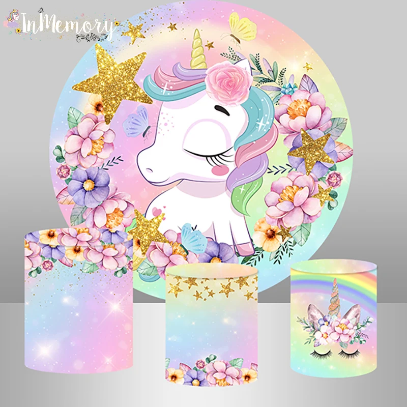 Круглый фон детский Единорог день рождения Круглый фон Радуга золото звезда цветок детский день рождения декор стол цилиндрическая крышка