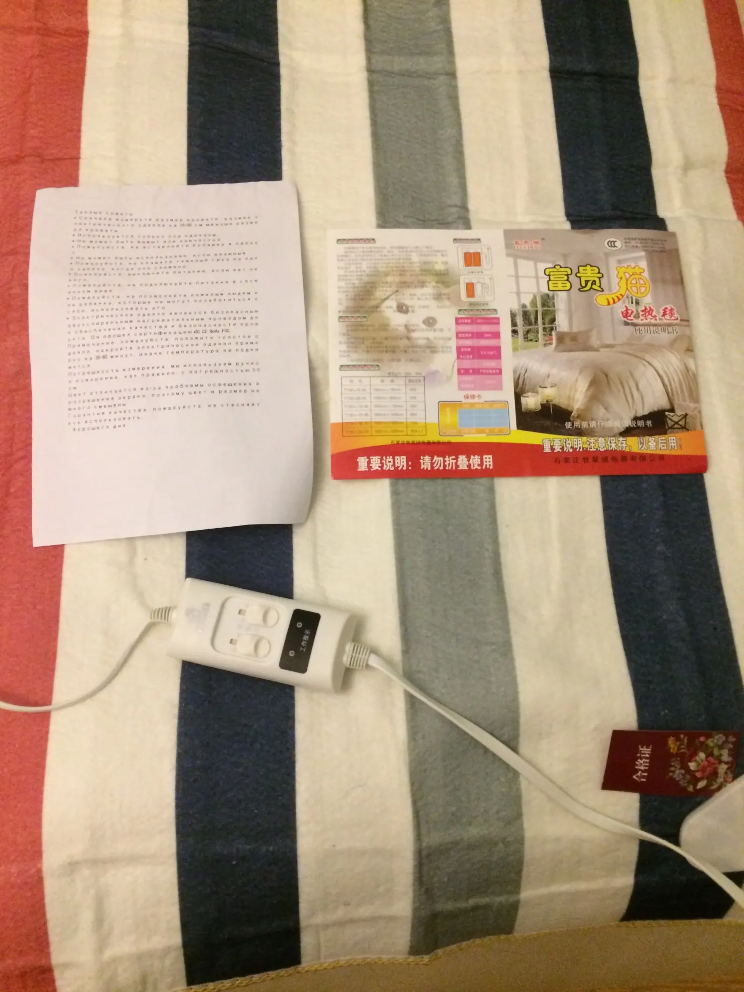 огромное спасибо за 1 одеяло. прибыло довольно быстро. одеяло рабочая . греет это хорошо. на втором режиме даже очень хорошо. с продавцом не общался. расцветка мне понравилась. лучше использовать под покрывалом а сверху простыней. проводки идут поперёк одеяла. один минус, сетевой шнур не совсем длинный, всего 2 м. в остальном всё прекрасно. сколько отработает отпишусь