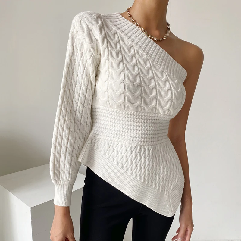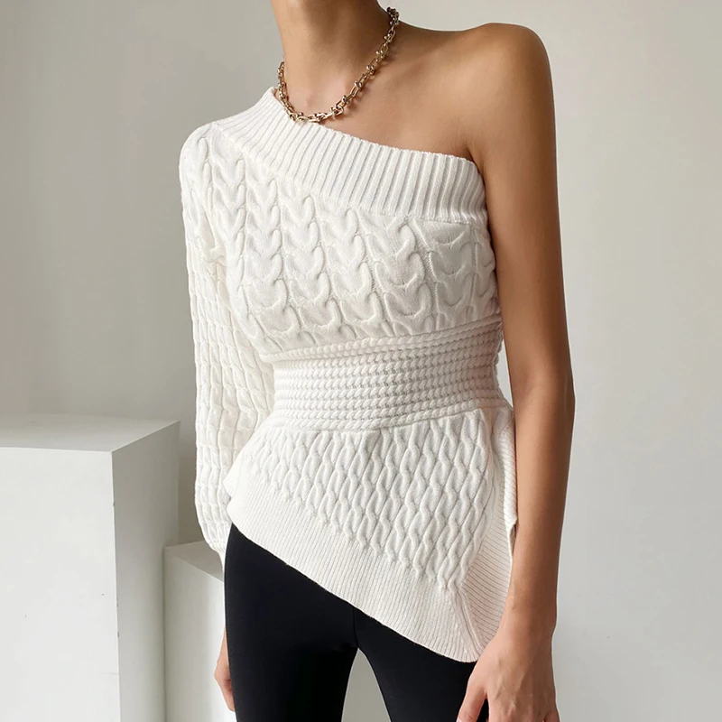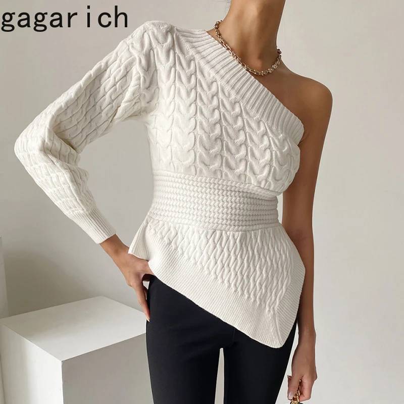 Gagarich Женский пуловер 2021 осенний косый воротник рукав до локтя с открытыми плечами необычный Тонкий льняной узор Талия трикотажный свитер